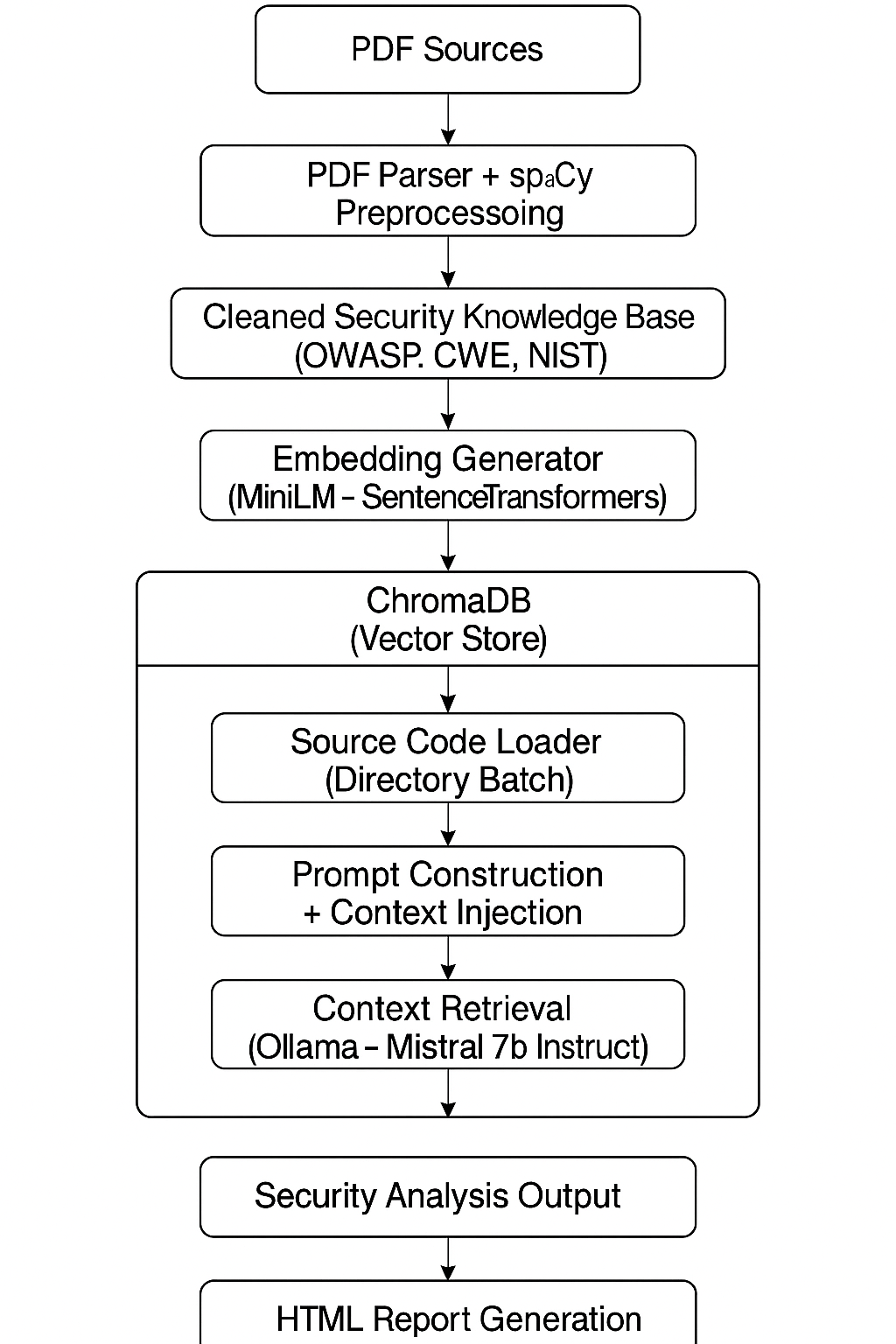 A primeira etapa foi coletar e processar a base de conhecimento que alimentaria o RAG. Usei documentos oficiais de segurança no formato PDF, incluindo OWASP Top 10, CWE e NIST. Para extrair o conteúdo relevante, utilizei o PyMuPDF para fazer o parsing dos PDFs e o spaCy para limpeza, tokenização e remoção de informações irrelevantes. Essa etapa é importante porque qualquer ruído desnecessário impacta diretamente a qualidade dos embeddings gerados depois.